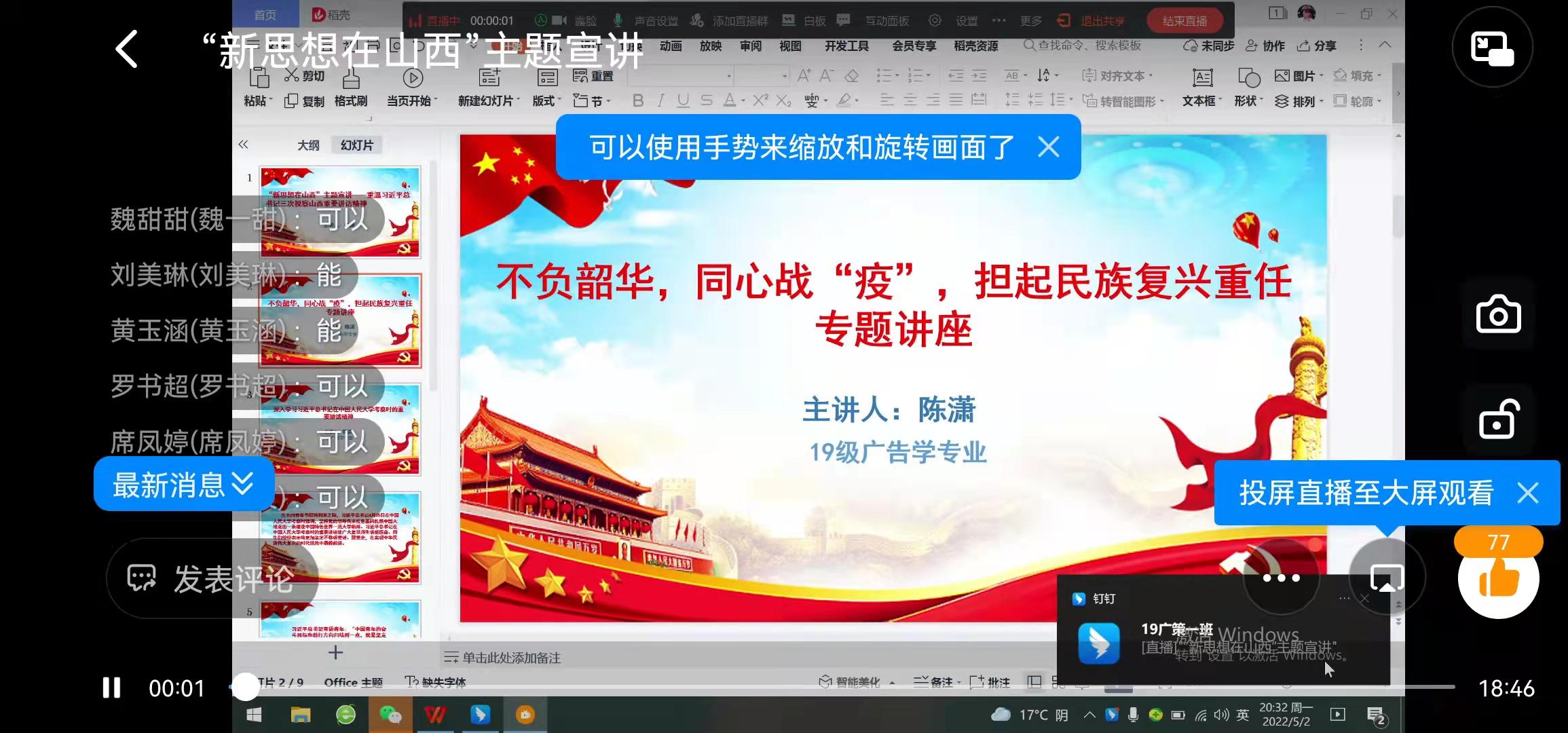 为深入贯彻学习伟大抗疫精神,感悟领会令人惊叹的中国力量、中国精神、中国效率,有力推动了疫情防控形势持续向好,展现出为家为国的英雄气魄,2019级广告学专业辅导员陈潇带领全体学生召开了主题为“不负韶华,同心战疫,担起民族复兴重任”专题讲座。